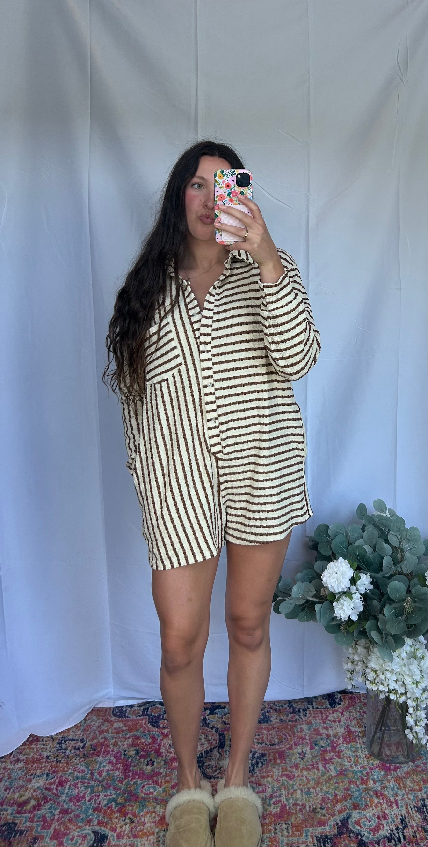 Collared with long sleeves and a drop shoulder. Raw edge details featuring a chest pocket. Oversized fit, with size chart in pictures. Model is wearing a large.