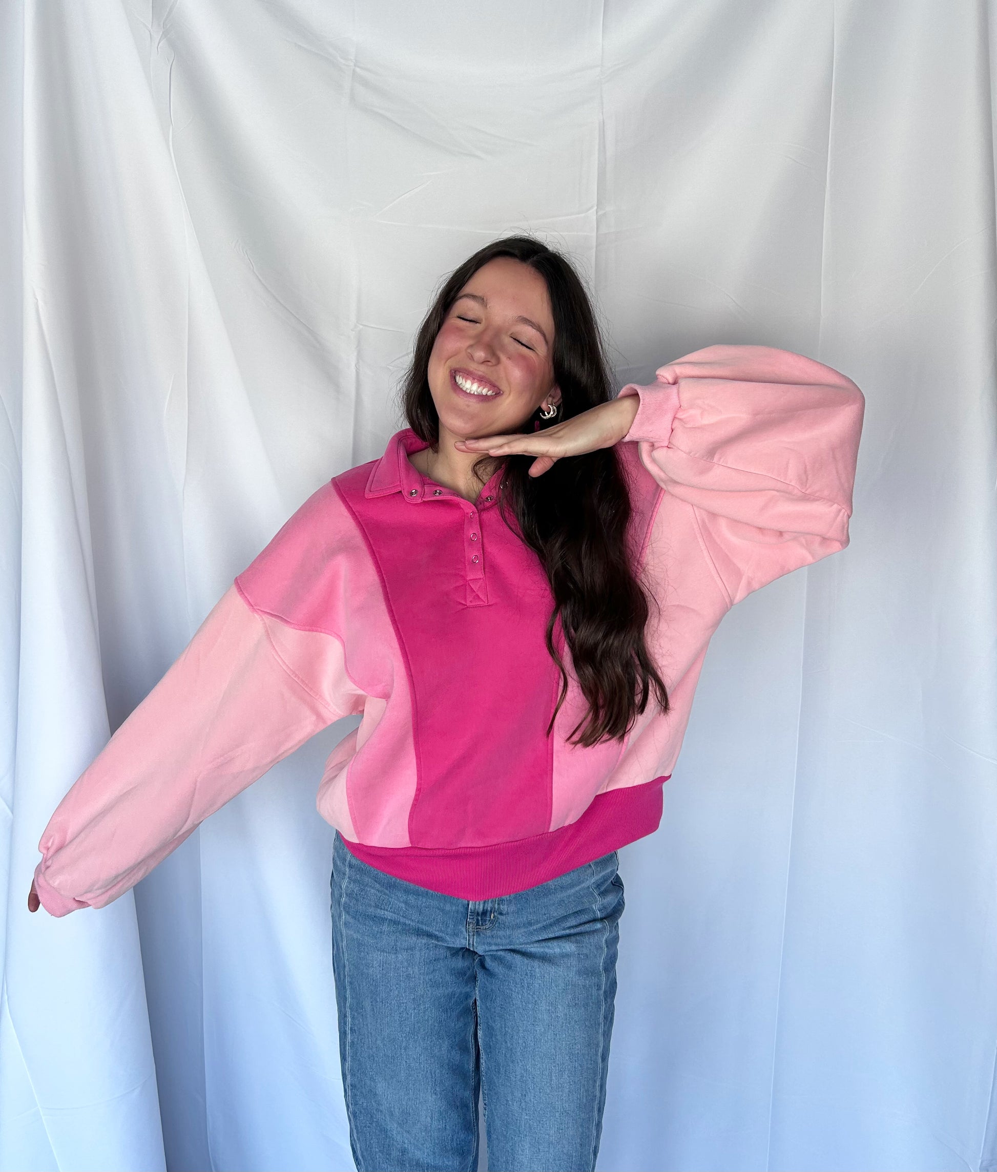 Your new go-to layering piece. This multi-pink colorblock pullover sweatshirt is the definition of effortless style with a cozy twist. Designed with a snap-button collar and oversized balloon sleeves, it adds the perfect pop of color while still being easy to throw on and go. Pair it with leggings for a laid-back look or dress it up with denim for everyday wear.